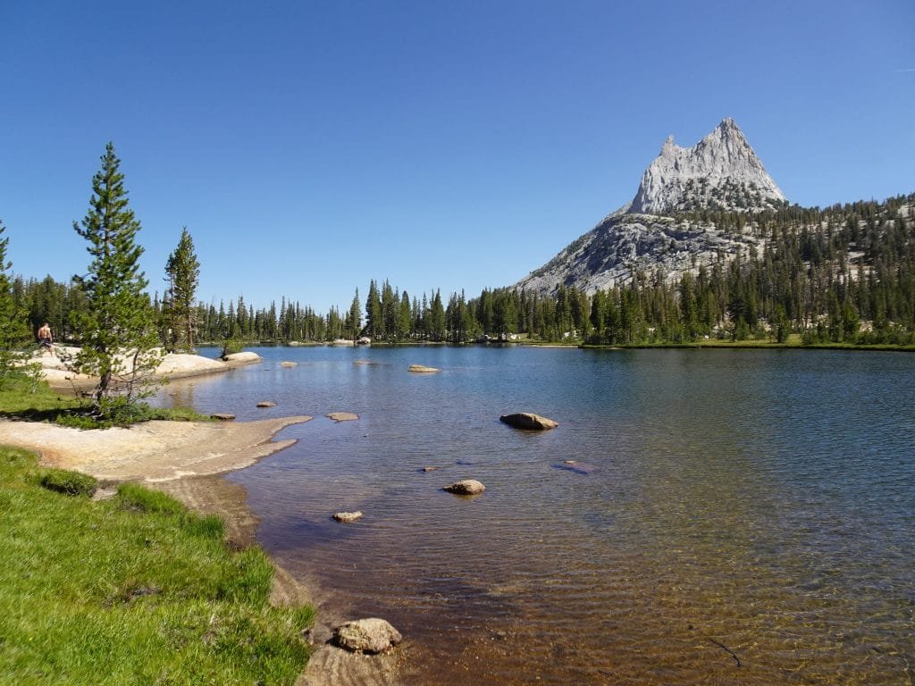 A passing ranger encouraged me to stay the night at the lakes and it would probably be nicer than staying at the Tuolumne Meadows Backpackers Camp, but it wasn’t even noon so I decided to continue to Tuolumne Meadows. Staying at the lakes would put me a half day behind my schedule and I’d hate to have to be behind after only 3 days. I also decided not to take the 1 mile round trip detour to see the lower lake. It wasn’t part of the JMT, so I decided to conserve the wear and tear on my legs and feet. It was an easy day hike (but I’ve never bothered to day hike it before). 🙂