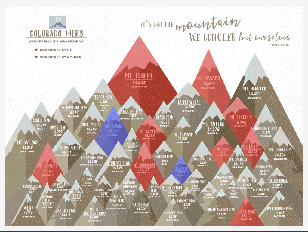 Highlights of all of the 14ers that I climbed, hiked, or drove up: