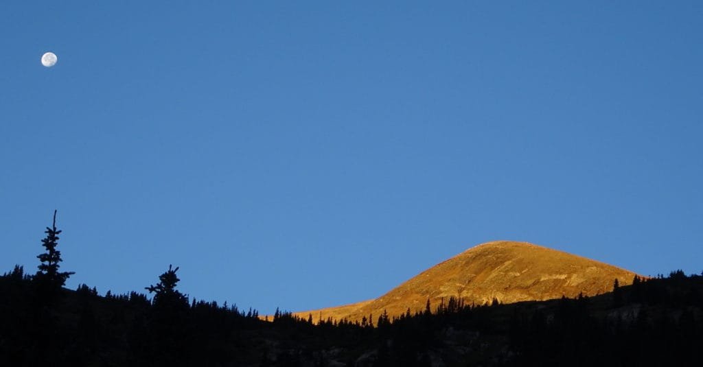 This day started with another fun 4WD road for my Jeep to lumber over (not as bad as the Huron Peak 4WD road, though), but when I arrived at the trail head I saw a large bowl with a lake surrounded by mighty mountains, 3 of them 14ers. The rising sun had just started to illuminate the mountains to the west when I arrived and even the moon hung over the western mountains as if posing for a picture. I obliged it. 🙂