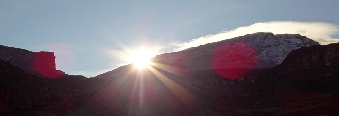 I think the blocked beam of light in the photo below is from Mawenzi, the second volcanic peak of Kilimanjaro. Although you couldn’t see it from the Shira 1 Camp, it would have stuck up over the horizon on the other side of Kilimanjaro and blocked the rising sun to produce the break in the light seen below.