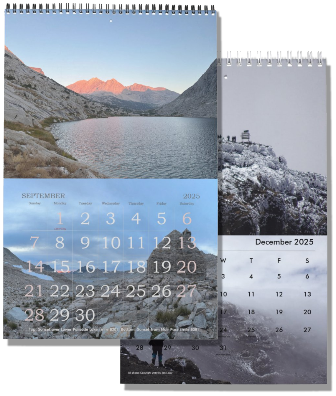 I put together a new Pacific Crest Trail Calendar. It covers PCT California Section G & H, with a side hike up to the Summit of Mt Whitney! It was actually hard to choose just 28 pictures to use (2 per month, plus 4 for the front and back covers). But the end results was pretty good looking, so I wanted to share with all.